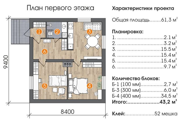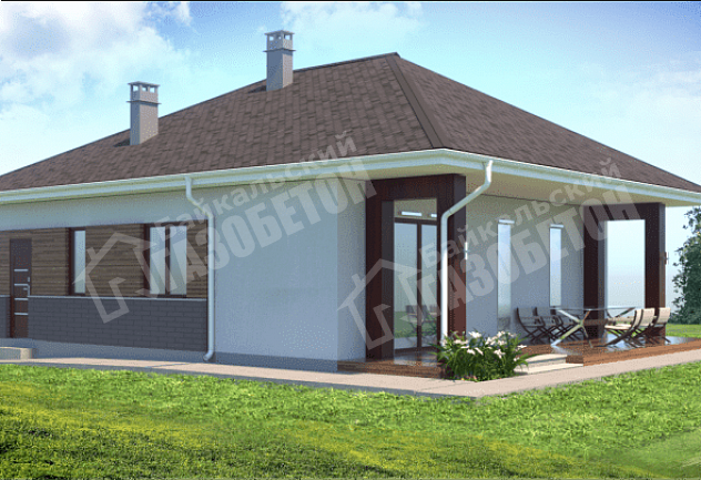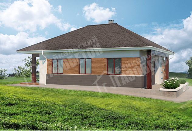 Средних размеров одноэтажный дом с интересным планировочным решением. Три спальни, проходная кухня, примыкающая к просторной гостиной и компактно расположенные бытовые помещения позволяют комфортно разместиться большой дружной семье.